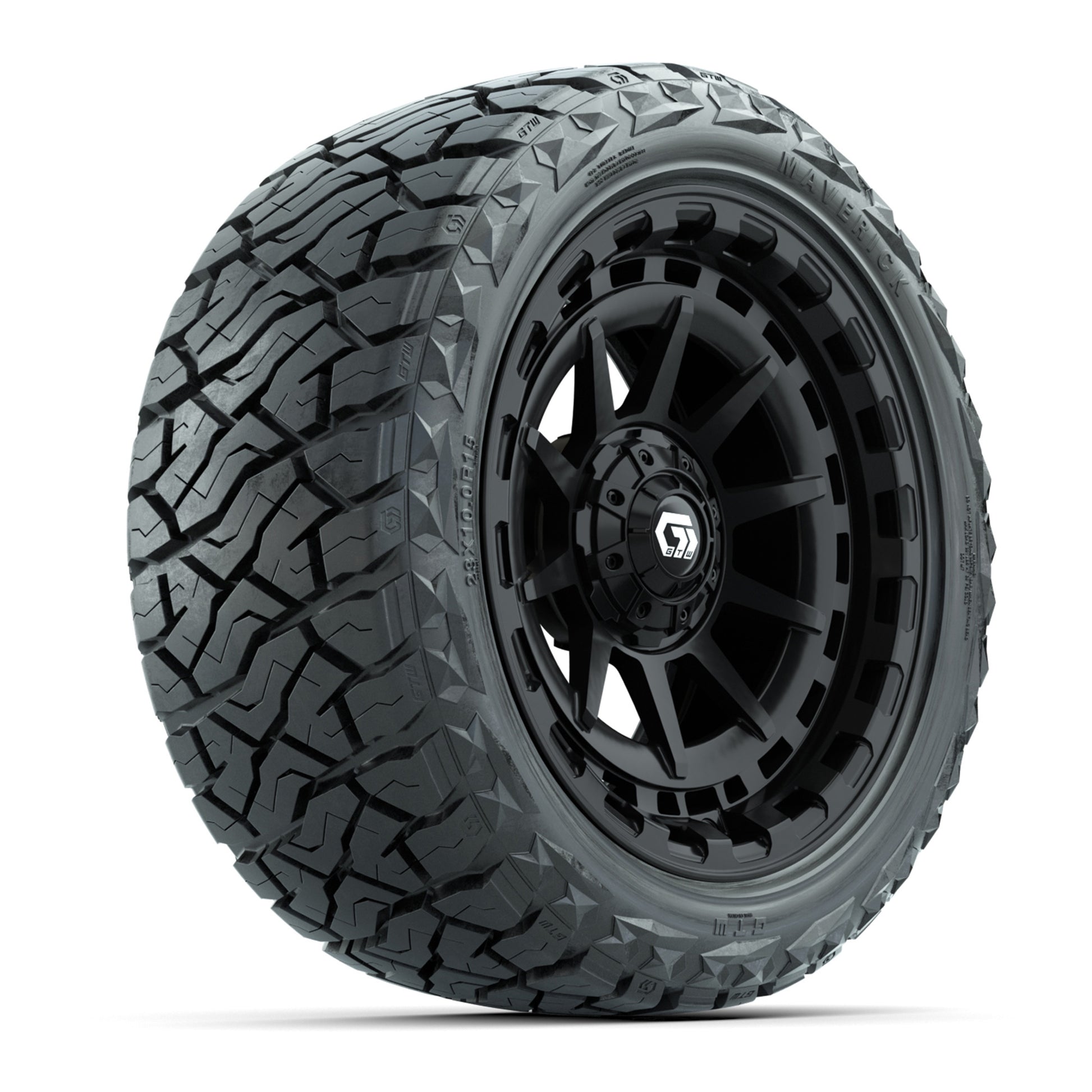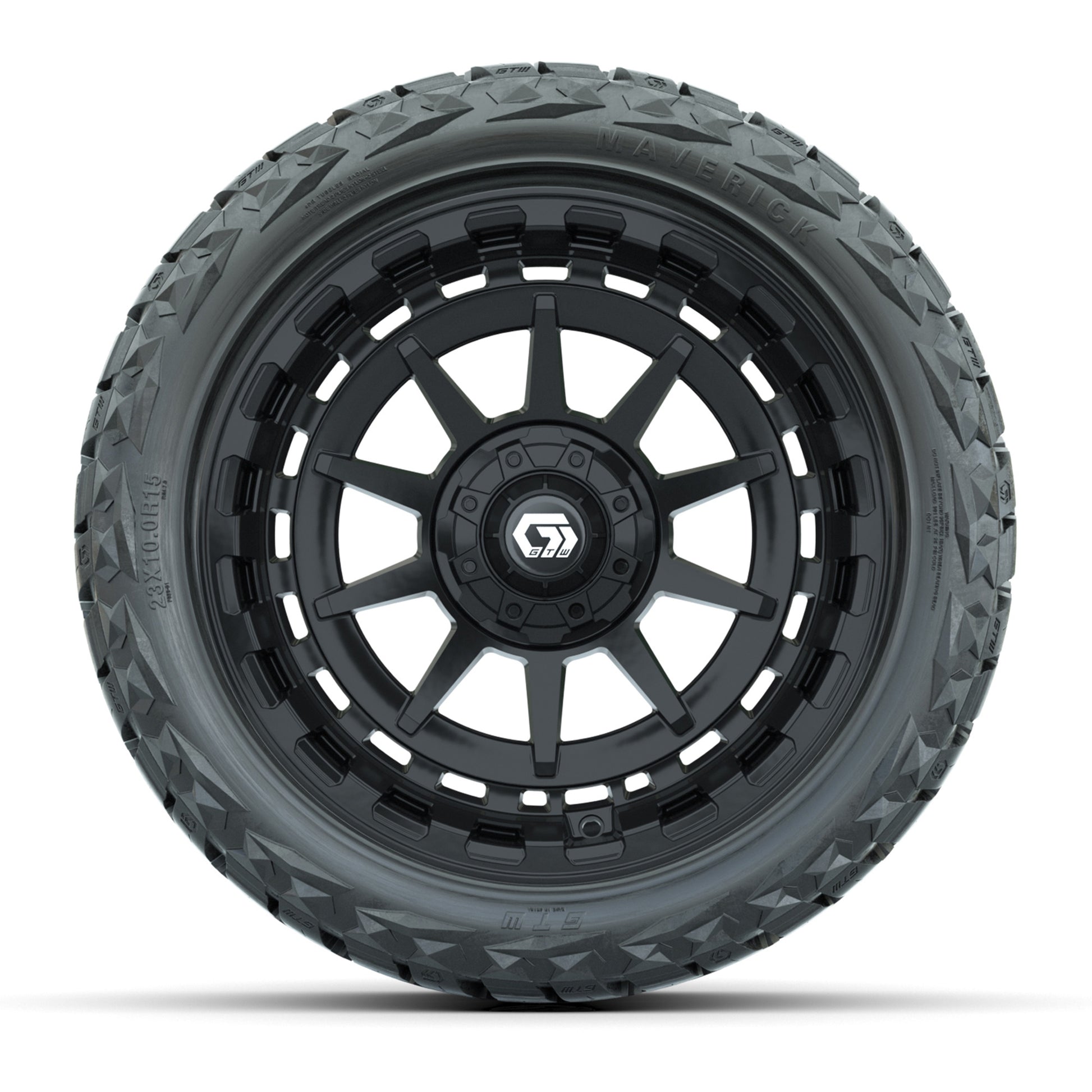 A set of (4) 15-inch GTW® Barricade golf cart wheels Mounted on 23x10.00-R15 Maverick All-Terrain Tires