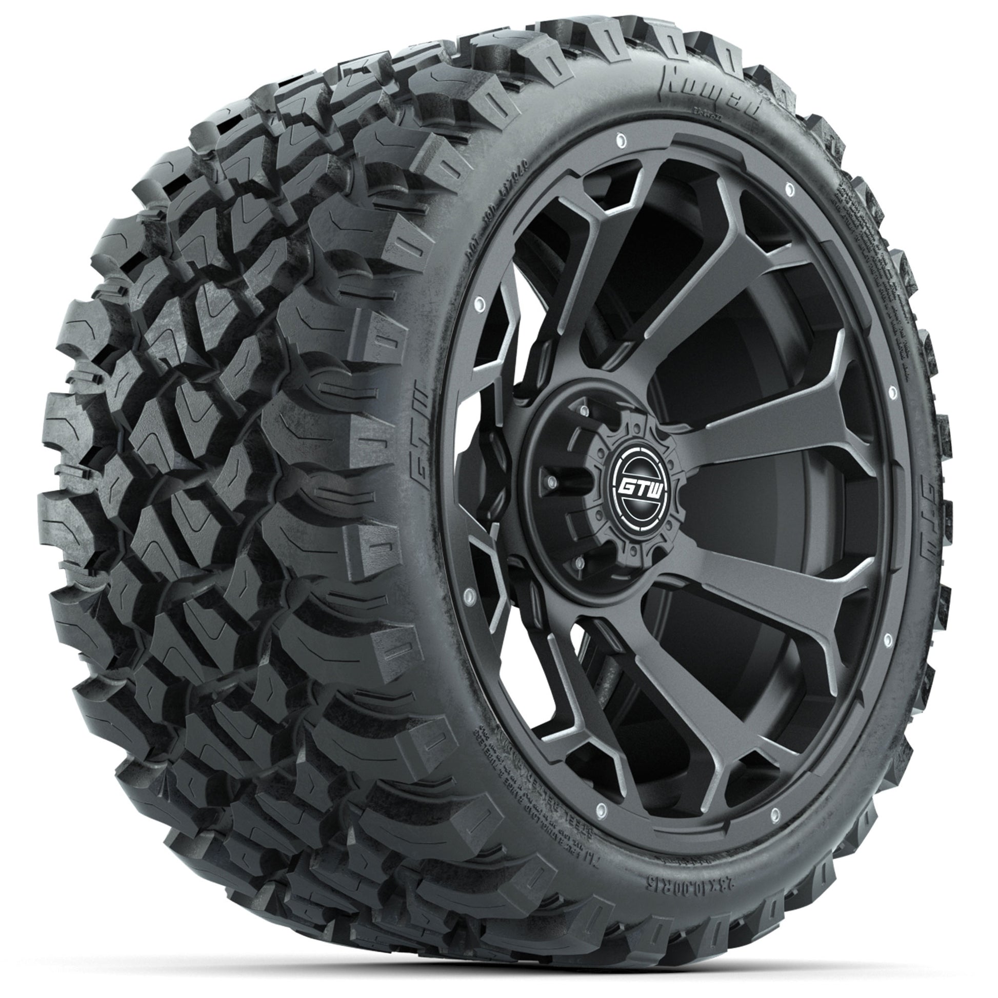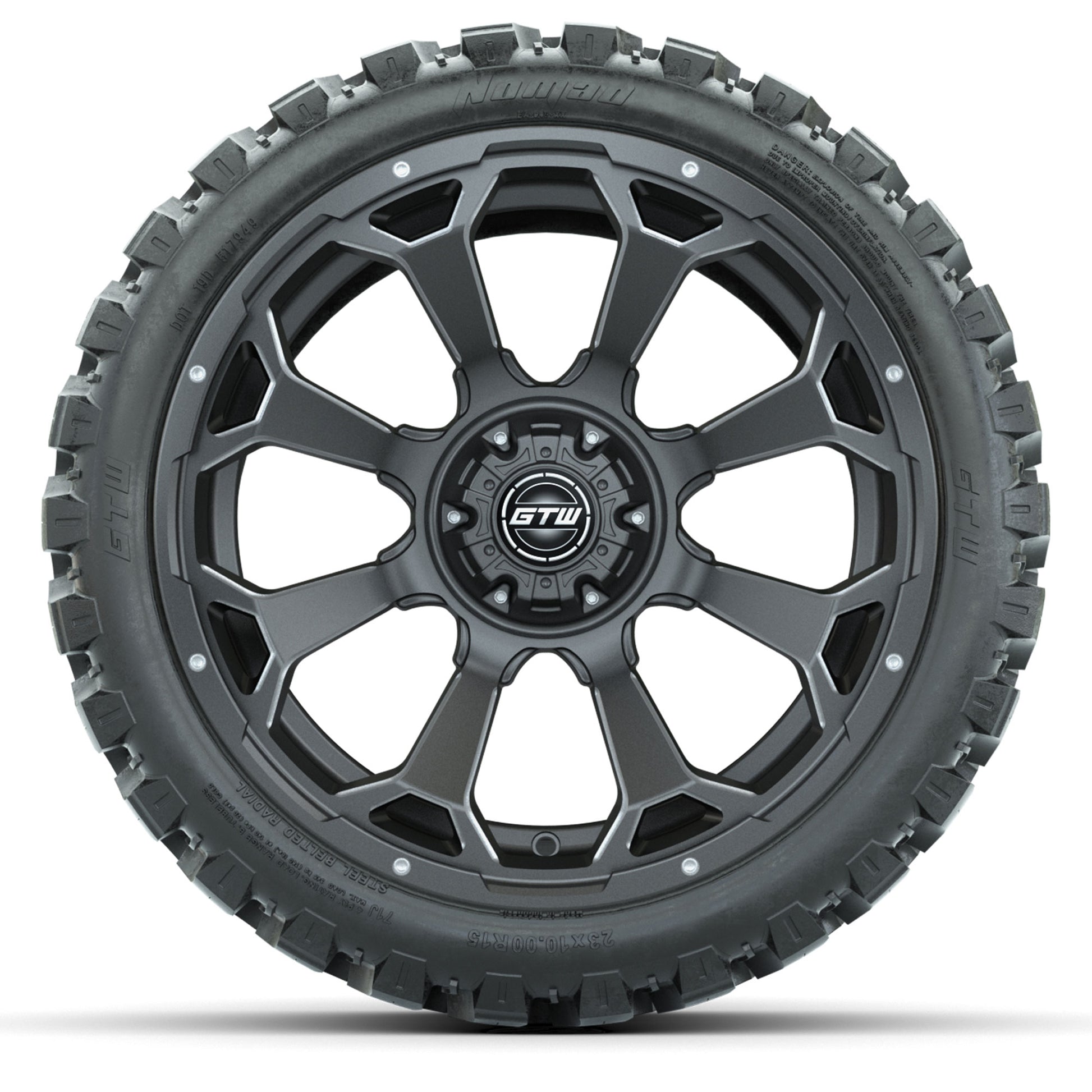 Set of (4) 15-inch GTW Raven Matte Gray golf cart wheels mounted on 23-inch GTW Nomad All-Terrain tires