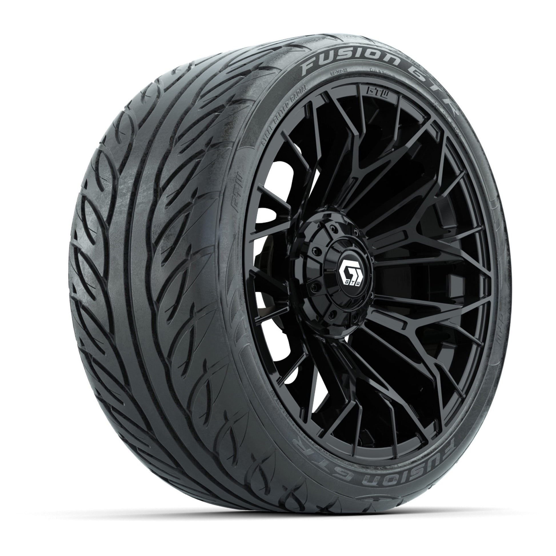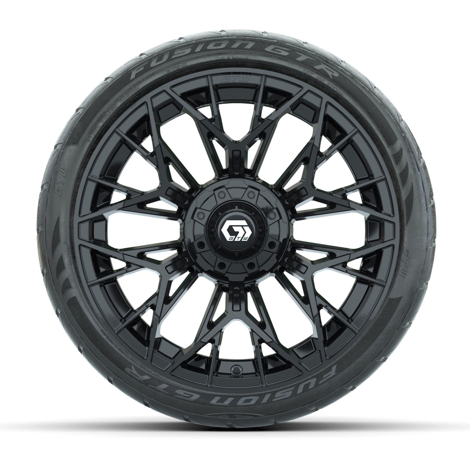 A set of (4) 15-inch GTW® Stellar Matte Black golf cart wheels Mounted on 215/40-R15 GTW® Fusion GTR Steel Belted Street Tires