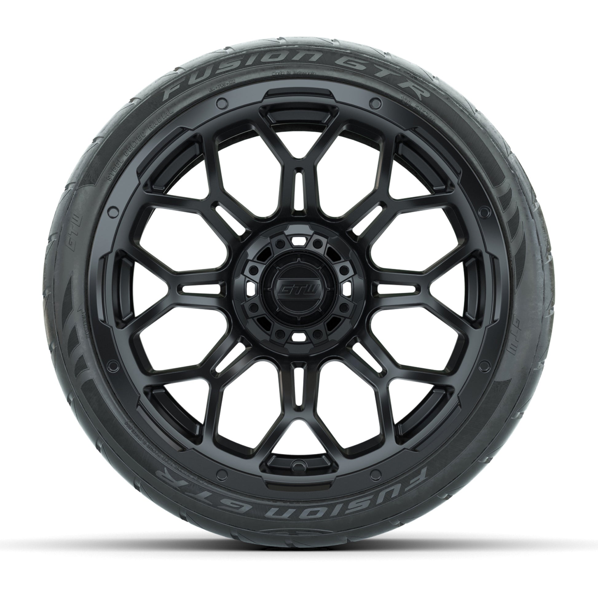 A set of (4) 15-inch GTW® Bravo Matte Black golf cart wheels mounted on 215/40-R15 Fusion GTR Steel Belt Radial Street Tires
