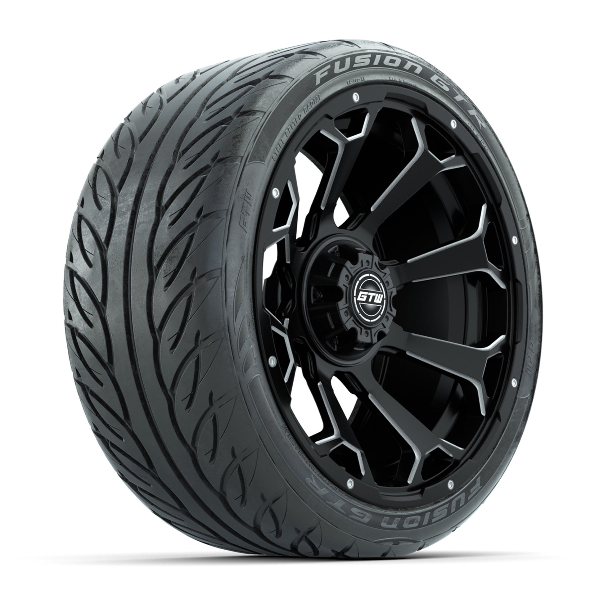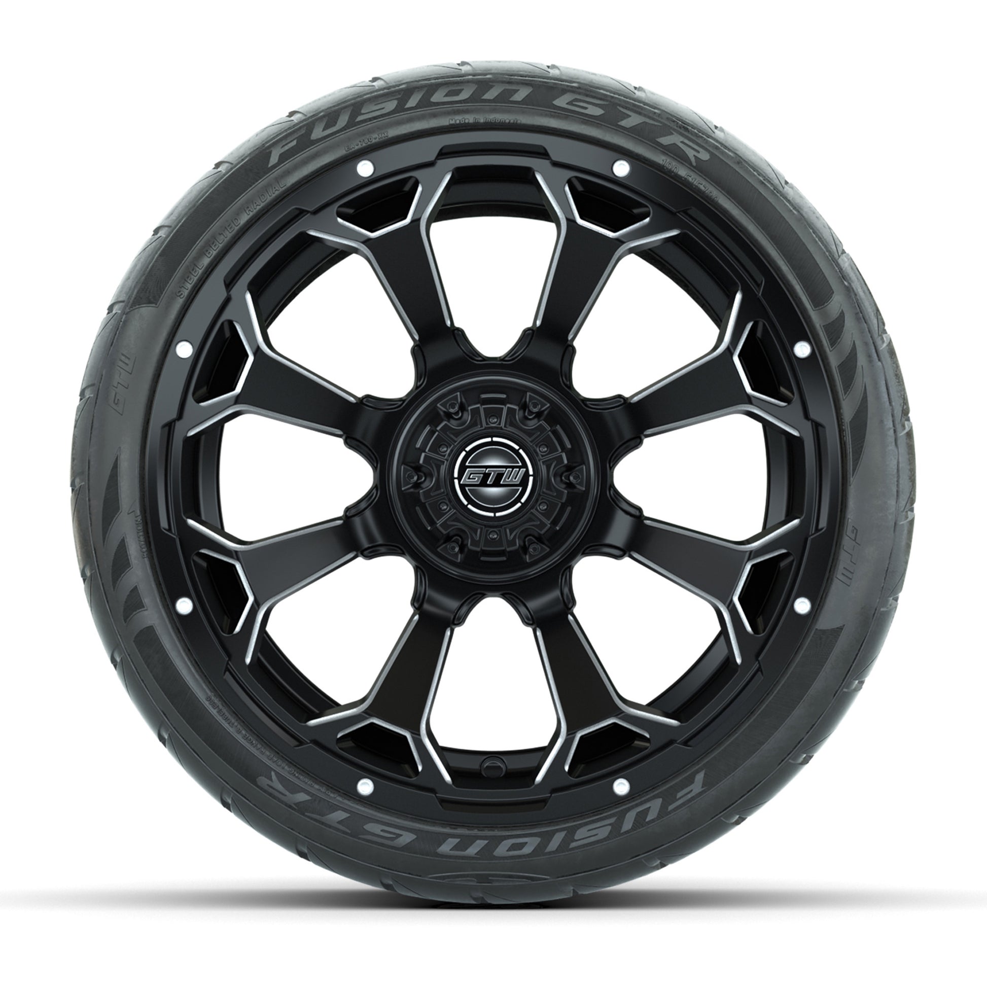 A set of (4) 15-inch GTW® Raven Matte Black/Ball Milled golf cart wheels mounted on 215/40-R15 Fusion GTR Steel Belt Radial Street Tires