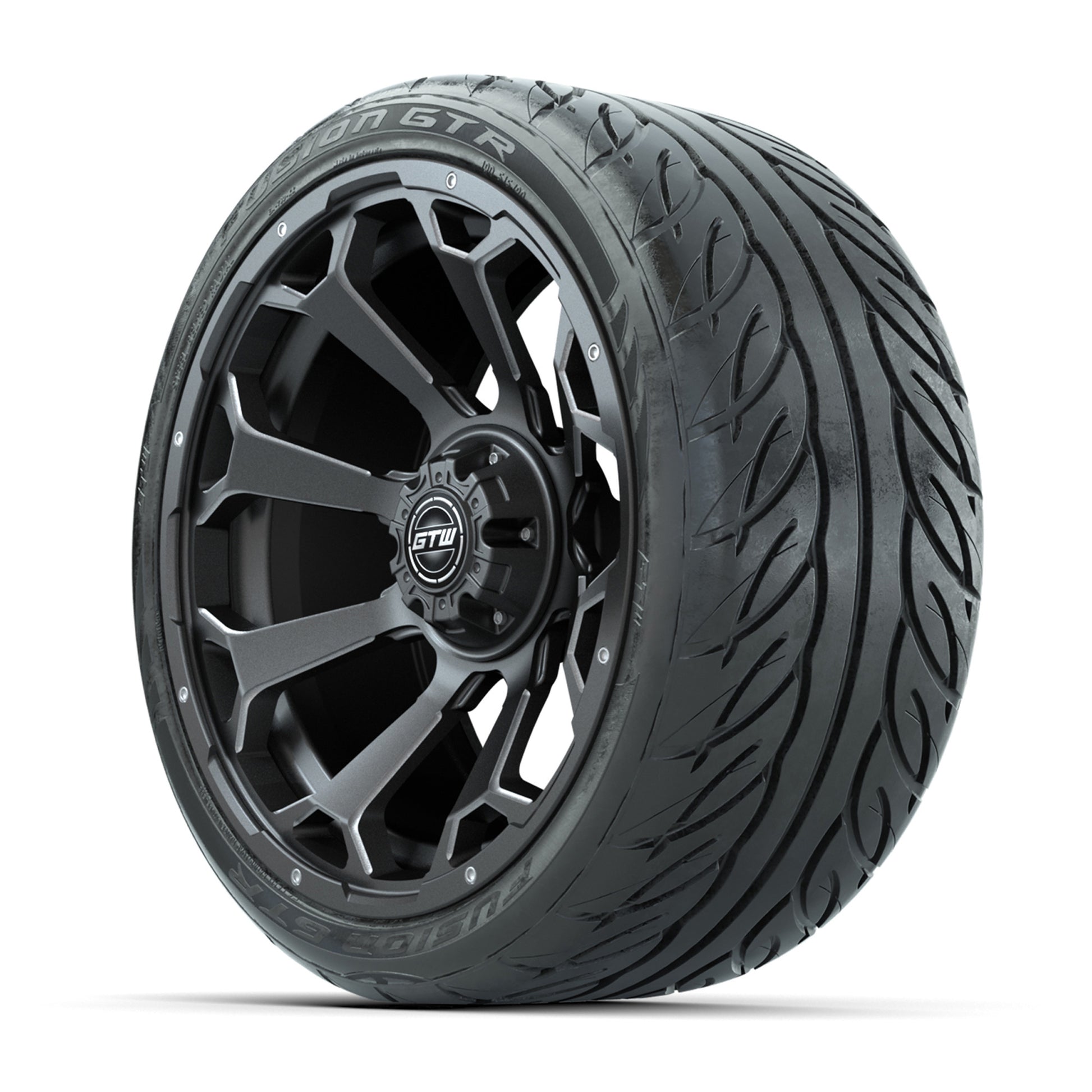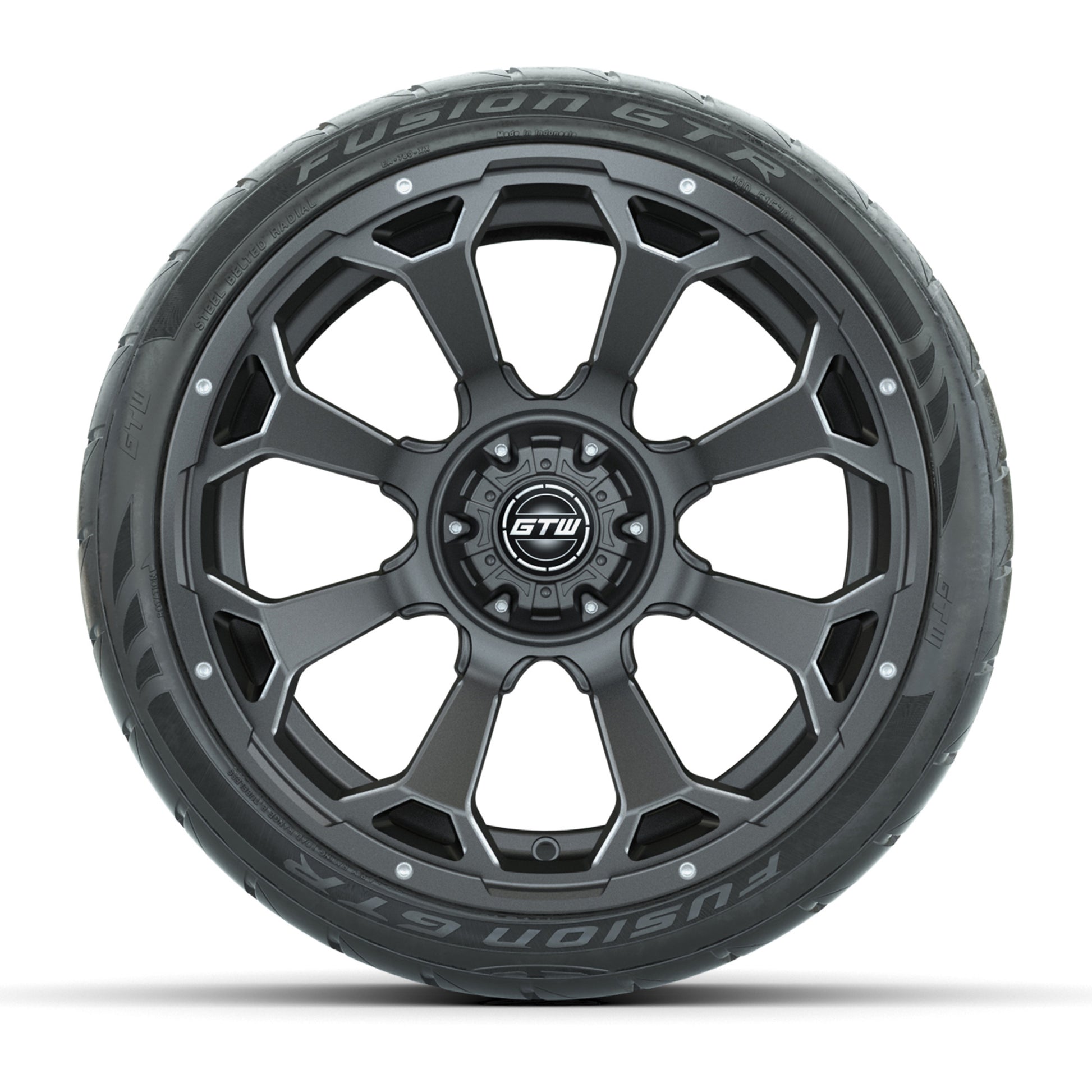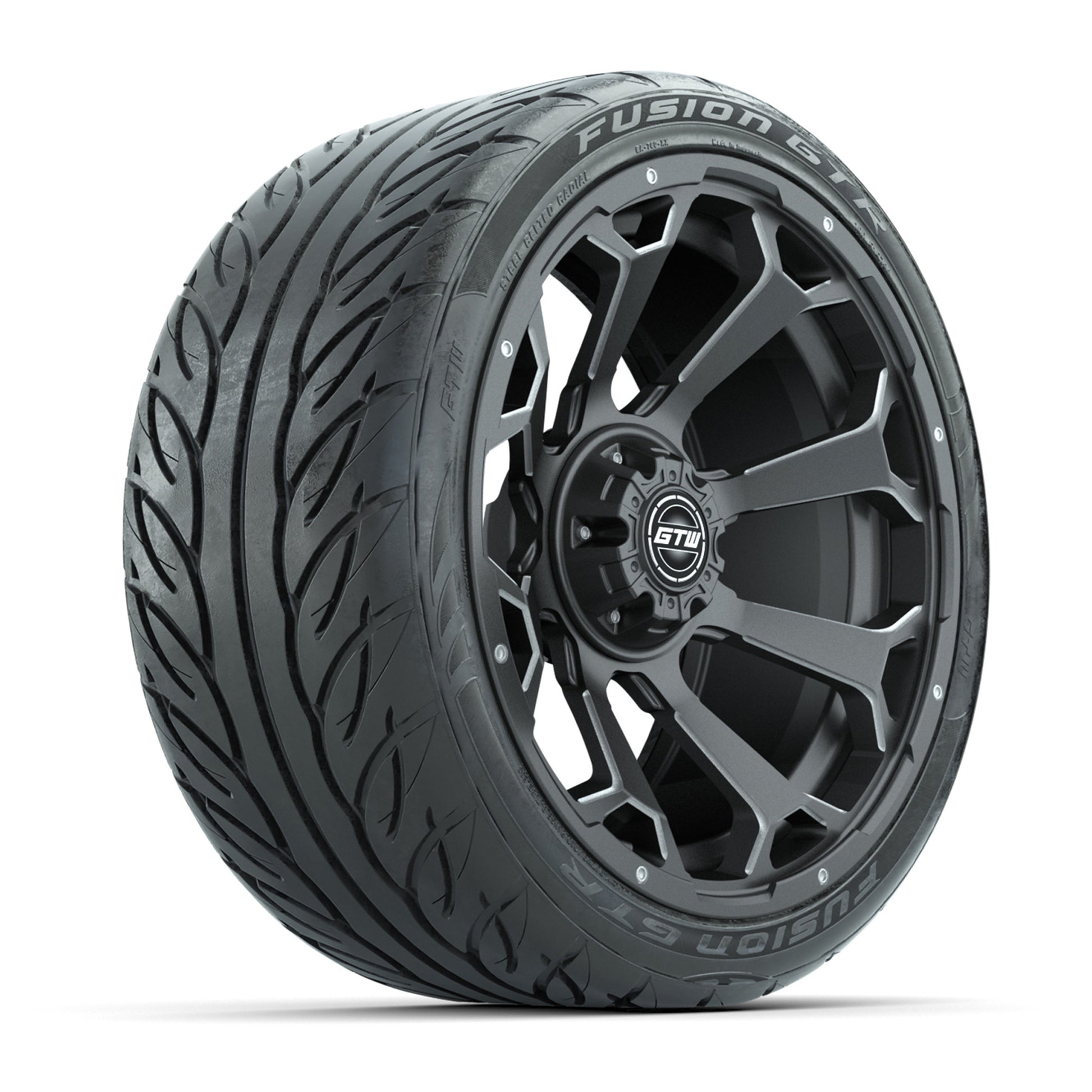 A set of (4) 15-inch GTW® Raven Matte Gray/Ball Milled golf cart wheels mounted on 215/40-R15 Fusion GTR Steel Belt Radial Street Tires