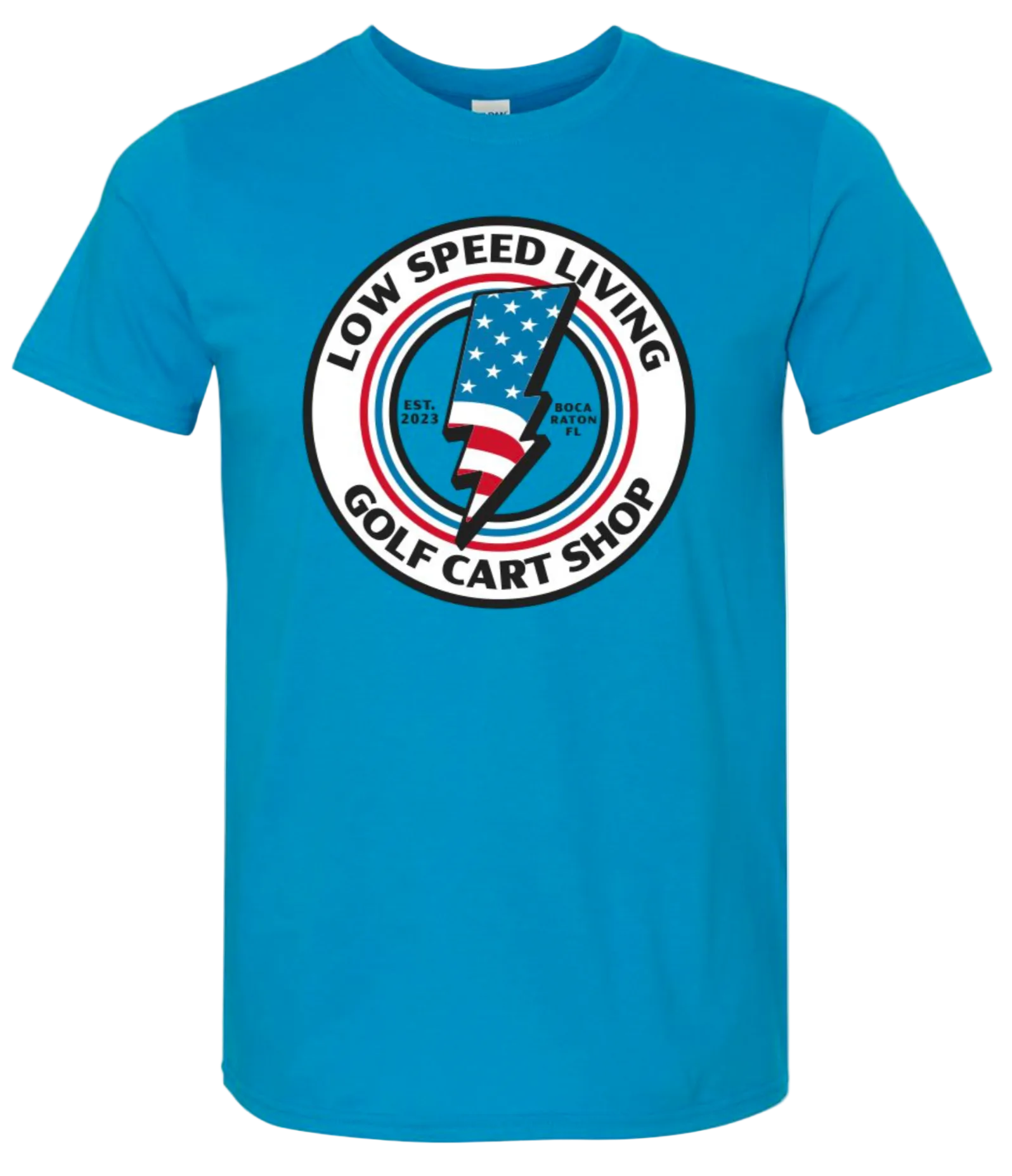Bright Blue Gildan Soft Style T-Shirt with our Bolt Logo