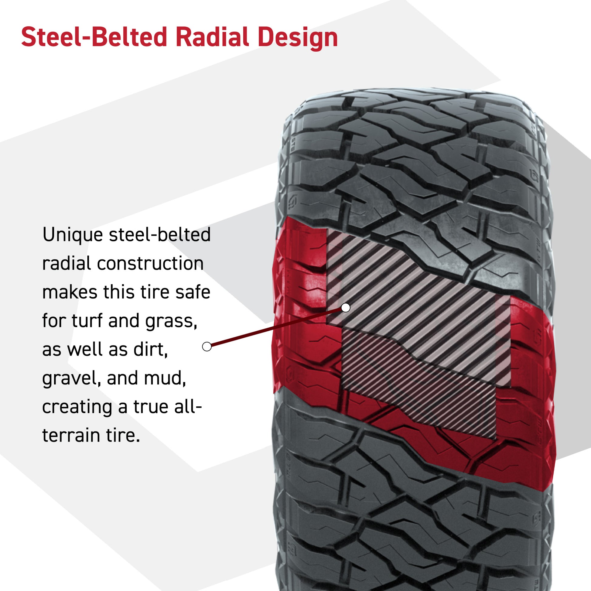 - Steel-Belted Radial Construction: Built for durability and comfort, featuring a 2-ply nylon and 2-ply steel design that enhances puncture resistance, reduces road noise, and provides better stability and traction on all terrains
